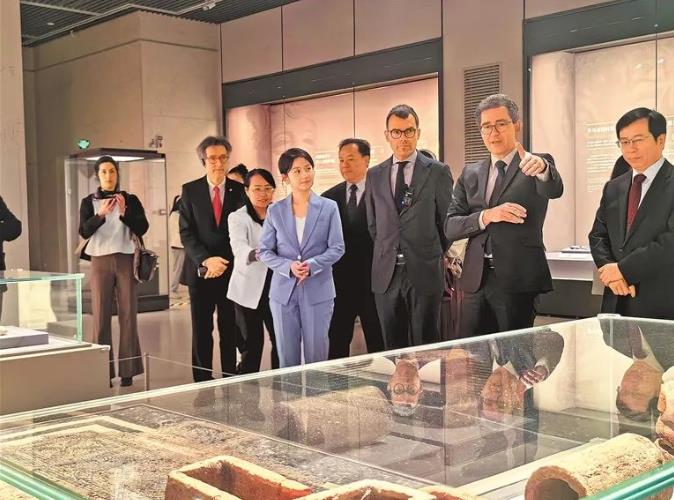 盧森堡駐華大使盧睿朗(右三)一行走進“小而美——盧森堡文物精品展”現場。