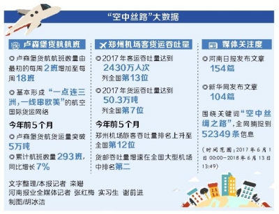 2017年8月17日和21日,省政府常務會議和省委常委會會議先后審議通過了《鄭州—盧森堡“空中絲綢之路”建設專項規劃(2017—2025年)》和《推進鄭州—盧森堡“空中絲綢之路”建設工作方案》,明確將飛機租賃業作為建設鄭盧“空中絲路”重點發展的產業,帶動我省產業結構轉型升級。