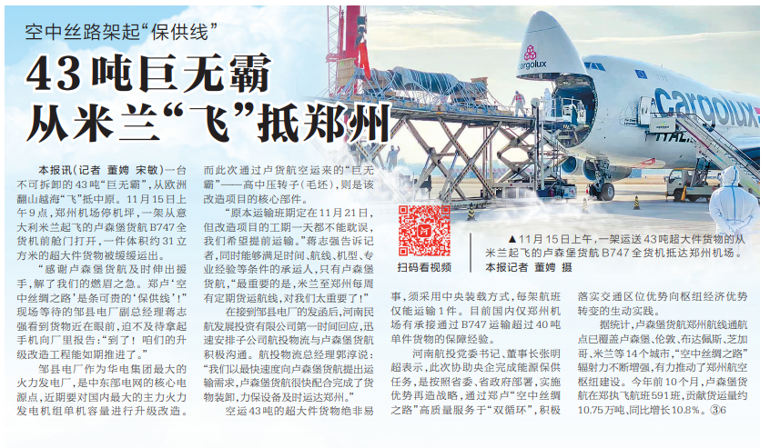 “感謝盧森堡貨航及時(shí)伸出援手,解了我們的燃眉之急。鄭盧‘空中絲綢之路’是條可貴的‘保供線’!”現(xiàn)場(chǎng)等待的鄒縣電廠副總經(jīng)理蔣志強(qiáng)看到貨物近在眼前,迫不及待拿起手機(jī)向廠里報(bào)告:“到了!咱們的升級(jí)改造工程能如期推進(jìn)了。”